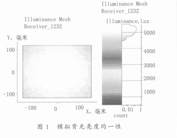 采用STAMPER 技术,一体成型射出导光板,减少印刷环节,较少印刷污染。以模具射出形成网点,入射面设计能破坏光源的全反射,并控制光源射出导光板面角度的分布,网点数量的多少对光源做有效的控制。网点可随模具任意设计形状,若网点为极小的平滑镜面,可使光在网点及导光板内部的损失减至最小,应用光学设计软件进行网点设计。图1 所示为模拟的背光组件的亮度均一性。