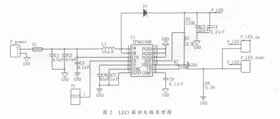 在侧光式背光组件中, 应用长条式的LEDlight- bar 作为整个组件的光源,LED light- bar 采用白光顶发光LED.以某机种产品为例,单颗功耗:3.2V×0.02A=0.064W.整个light- bar 功耗:0.064W×42=2.69W.LED 背光源电路设计主要包括发光条设计和驱动控制电路设计,驱动电路采用一款DC/DC 恒流驱动芯片,对发光条进行恒流驱动。图2 所示为LED light- bar 的驱动原理图。