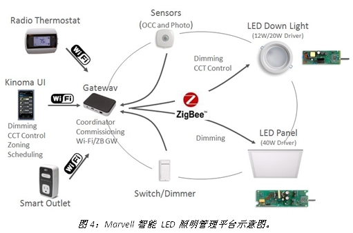 Marvell智能 LED照明管理平台提供了完全集成的LED照明和无线控制系统,因此不论是易用性的提升还是安装成本的降低都趋向于极致,大大简化了使用和维护难度,使得非专业人员也能轻松应对。该平台的一大特色是允许终端用户可以使用智能手机和平板电脑方案,使他们可以方便地从任何地方管理、分析并维护一个更具性价比的数字照明方案。