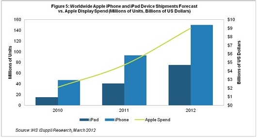 据IHS iSuppli公司的研究报告,由于预计iPhone和iPad产品出货量今年大幅增长,苹果2012年可能在这两款产品的显示器面板上面支出90亿美元,进一步确保其在平板电脑和手机市场中的主导地位。