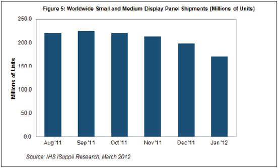 1月份中小显示器面板出货量约为1.713亿个,比2011年12月的1.986亿个大幅减少14%。这是该产业过去12个月以来的最大单月降幅,也是去年10月以来连续第四个月下降,如图1所示。