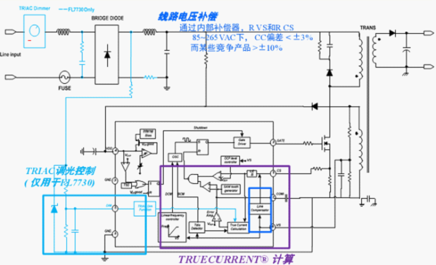 - FL7730驱动器具有功率因数校正(PFC)、TRIAC和模拟调光能力