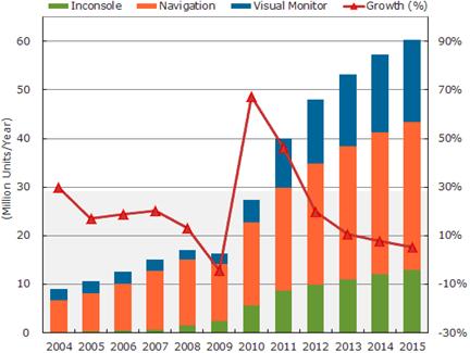 据NPD DisplaySearch– 平板显示器于车载的应用已经越来越盛行,如汽车导航、多功能驾驶仪表盘、以及后座娱乐显示屏幕等。NPD DisplaySearch预测应用于车载的面板出货量将有望从2011年的4千2百万片成长到2015年的6千2百万片。