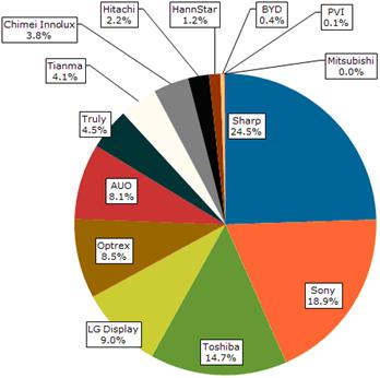 夏普为领先厂商,拥有24.5%的市占率;索尼居次,为18.9%;东芝则有14.7%的市占率。