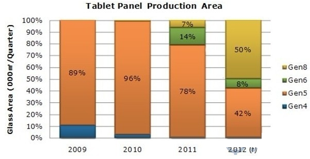 根据最新一季的季度大尺寸面板生产策略报告(Quarterly Large-Area Production Strategy Report)指出,在2011年前五代线为生产平板电脑面板(9”以上)面积最大的主要产线。然而,在2012年八代线将成为平板电脑面板最主要的生产工厂。