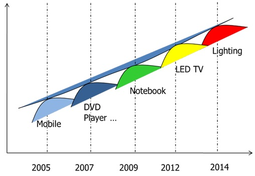 综观LED的发展过程,2002年起LED从小尺寸显示器(主要应用在手机上)开始渗透,在2005年达到高峰。但是随着效率的提升,单位显示器使用的LED颗数也逐渐减少。当手机成长趋于饱和状态下,LED总需求量便开始下滑。在此时LED便开始寻找下一个应用:中尺寸显示器。随着性价比的不断提升,LED于2007年在中尺寸显示器的需求达到饱和,与先前小尺寸一样LED需求开始往下。LED开始进入到另一个应用:笔记本电脑显示器,并于2009年底开始进入电视显示器的应用。随着LED在大尺寸显示器的广泛应用,LED的性能已经提升到每瓦100流明以上,而价格也快速下降,此趋势对于LED在照明应用的发展有着无比的助力。