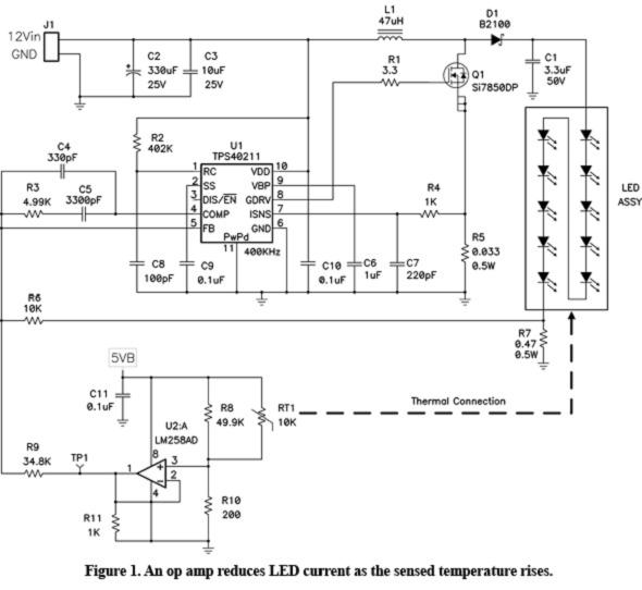 利用LED实现高亮度照明要求使用厂商允许的最大电流驱动,但LED的平均寿命高度取决于工作温度。工作温度仅上升10°C便可使其寿命缩短一半。这种情况迫使设计人员必须降低调节电流,牺牲亮度来延长使用寿命。如果要求LED在较高的环境温度下工作,则必须进一步降低电流来最小化环境到芯片温升,以保证使用寿命。但是由于存在温度上限,这样做会降低中低环境温度范围的照明亮度。本质上来说,我们是通过降低亮度来实现高温环境工作的。图1显示了一个使用热敏电阻控制运算放大器 (op amp) 的LED驱动电路,其在LED电路板温度上升时降低驱动电流。