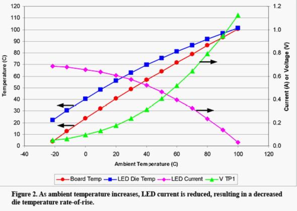 图2 环境温度上升,LED电流降低,从而达到更低的芯片温升速率。