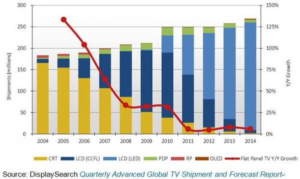 根据NPD DisplaySearch季度全球电视出货和预测报告Quarterly Advanced Global TV Shipment and Forecast Report指出,全球电视出货量连续两年持平,2012年出口到西欧、日本等发达市场的电视总量预计将较去年下降11%,由此抵消了新兴市场8%的年成长。尽管如此,随着CRT和等离子电视逐步淡出市场,液晶电视将持续获得更大市场份额。