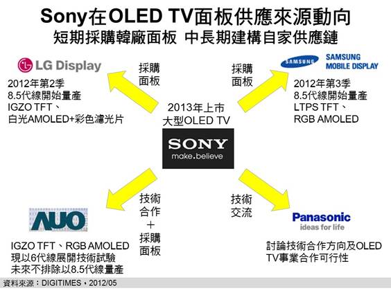 2012年下半至2013年南韩两大面板厂商因具备大尺寸OLED TV面板量产能力,且Sony具备庞大LCD TV面板采购力(2011年占全球10%)可作谈判筹码,因此黄铭章预期,南韩面板厂尤其是Samsung面板事业,将会供应给Sony所需面板;但中长期而言,南韩三星与LG与Sony在电视市场针锋相对,因此Sony仍会希望建构自家供应链,此时,具备OLED技术及大尺寸TFT产能可供转换为OLED生产线的友达,将较有机会打入Sony OLED TV的供应链中。