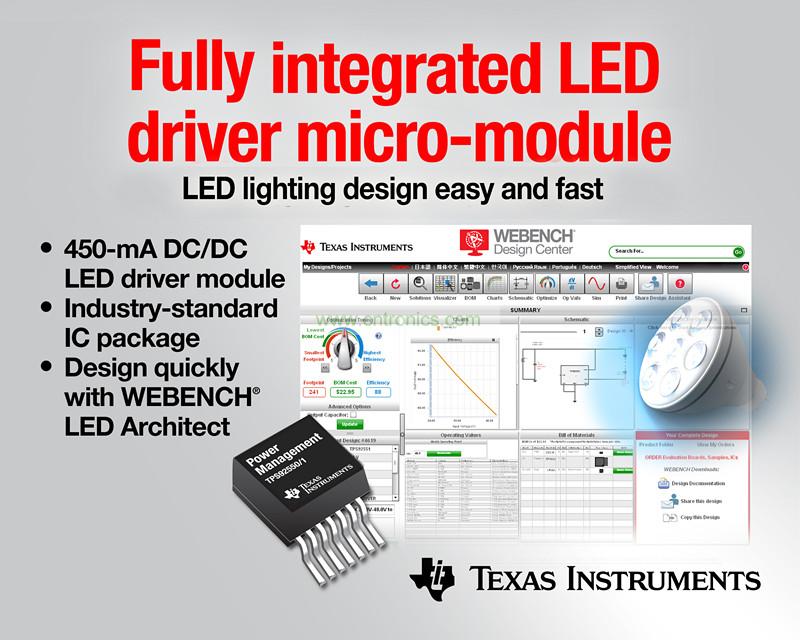 日前,德州仪器 (TI) 宣布推出两款全面集成型 LED 驱动器微型???,其可消除 LED 驱动器设计中常见的外部组件及复杂布局安放问题。该 450 mA TPS92550 及 TPS92551 DC/DC LED 驱动器??槭且到缏氏炔捎猛骋?IC 封装集成所有所需电源及无源电路系统的产品,可为 LED 实现高达 23 W 的功率。如欲了解更多详情,订购样片与评估板,敬请访问:http://www.ti.com.cn/product/cn/tps92550。观看视频,请点击:http://www.ti.com/tps92550-prv。