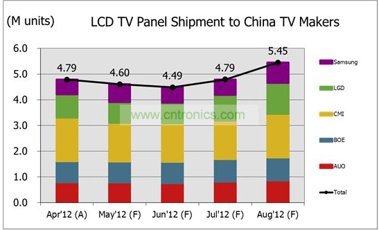 图一、2012年4-8月出货至中国本土厂商电视面板按供货商数量走势