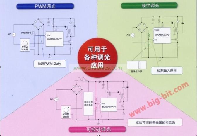 其主要特点是:可进行可控硅/PWM/线性调光。适用于各种调光应用(调光比0.2%-100%);内置缓冲功能,照度变化平稳(可选择有缓冲、无缓冲);通过LED平均电流控制,可针对输入电压、输入电压变化,控制相应的LED电流。这种对应可控硅调光的LED照明用驱动IC可用于兼容调光器的灯泡型LED照明、兼容调光器的LED筒灯照明和兼容调光器的LED基础照明。