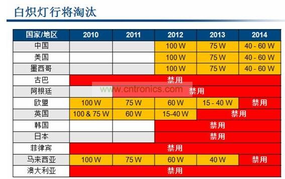 Power Integrations产品营销经理Andrew Smith道:“所有的国家都是先从大功率的100W白炽灯开始淘汰,接下来才是75W等小功率的白炽灯。欧盟在2010年就淘汰了100W白炽灯,美国、中国等则是在2012年开始淘汰。所以市场上对于能替换100W白炽灯的大功率LED是有非常强劲的市场需求的。”