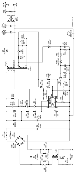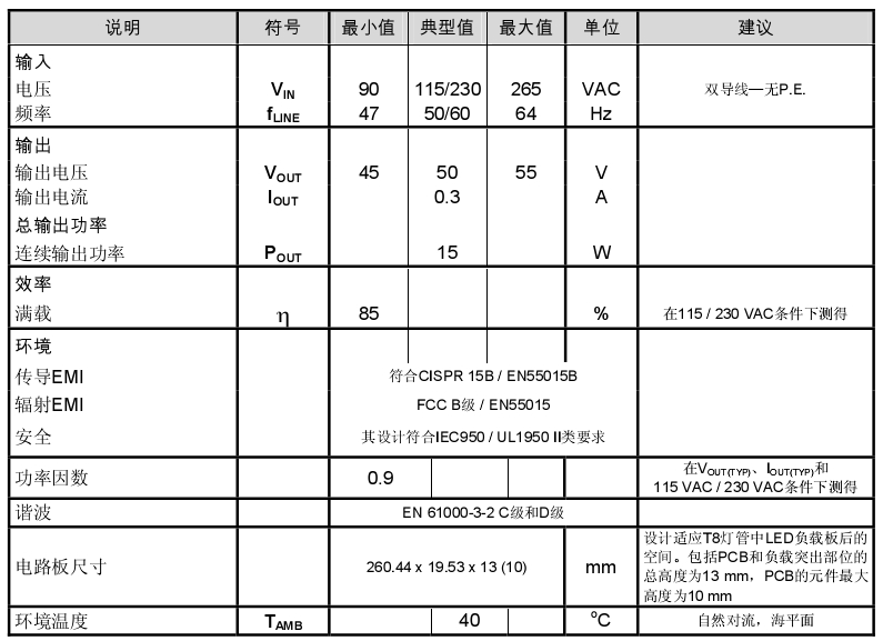 此设计的主要目标是超薄和高效率。这样有助于使驱动器板适应T8灯管内LED负载板后的空间,并将工作时的温升保持在可接受的范围以内。为此,必须认真选择元件和安装方法,但这相比于方案的更换更加简单,因为初级侧调节的LinkSwitch-PH设计所需的元件数量很少。