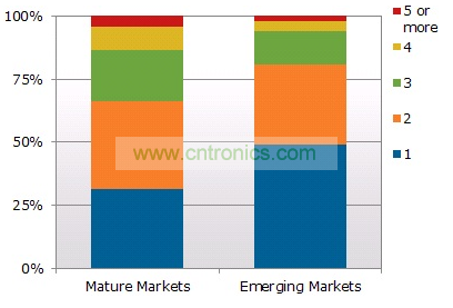 该报告还发现,在成熟市场家庭平均拥有2.4台电视,而在新兴市场平均每户为1.8台。成熟市场中,超过三分之二的家庭有一台以上电视,但在新兴市场近一半的家庭只有一台电视。鉴于平板电视持续推出新机种、价格益加实惠、以及消费者对高品质、大屏幕和高清晰度电视的消费欲望,和成熟市场的消费者一样,越来越多的新兴市场消费者购买平板电视(主要是液晶电视)来汰换他们现有的旧款式电视。