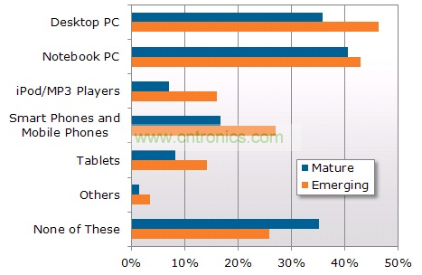 NPD DisplaySearch全球电视消费者换机调查还对家庭户进行了关于在其他设备上收看电视视频节目的调研,发现在新兴市场越来越多的家庭使用除电视以外的设备,包括平板电脑、智能手机和MP3播放器。