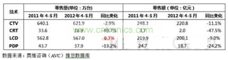AVC预测:全年电视零售量将达到4191万台,同比增长0.1%。其中,液晶和等离子电视销量将分别为3807万台和280万台,同比分别增长2.6%和8.1%,CRT销量继续快速下降到103万台,同比下降52.4%。