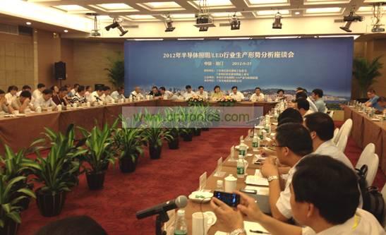 由中国半导体照明/LED产业与应用联盟主办、三安光电股份有限公司承办的“2012年全国半导体照明/LED行业生产形势座谈会”8月31日在厦门召开。工业和信息化部消费品工业司、电子信息司、福建省信息化局、厦门市经济发展局有关领导以及全国照明和LED领域60多家企业负责人、中国照明电器协会、中国光学光电子行业协会、福建省光电子行业协会、厦门市光电子行业协会等相关行业组织出席座谈会。