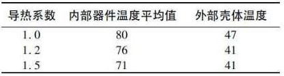 ( 3) 灌胶导热系数对驱动电源散热影响情况,由于电源的壳体结构已经确定,因此驱动电源的散热主要通过胶体传导,将热量传导到壳体,而后通过对流散热。表1 是导热系数不同的胶体的电源器件和壳体温度情况( 输入电压~ 100 V,输出48 V/3 A,环境温度25 ℃) .