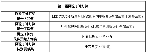 9日,在广州国际照明展览会开幕式晚宴上,同时举行了“阿拉丁神灯奖”大型颁奖盛典,现场宣布了评选的最终赛果,并颁发了相关的奖项。第一届“阿拉丁神灯奖”结果昨晚隆重揭晓,其中夺得“阿拉丁神灯奖最佳产品奖”为:欧司朗(中国)照明有限公司上海分公司的LEDTOUCH 轨道射灯;夺得“阿拉丁神灯奖最佳工程奖”为:北京光景照明设计有限公司的广州歌剧院照明设计。本届“阿拉丁神灯奖最佳贡献人物奖”颁发予所有照明行业从业者。另颁发“特别贡献奖”,由光亚集团董事长潘文波博士获得。