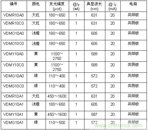今天推出的器件采用发光均匀、无污点的数码管和灰色封装表面。VDMx10A1系列LED数码管采用共阳极配置,封装高度只有2.1mm。VDMx10x0系列器件提供共阳极和共阴极配置,封装高度为3.75mm。