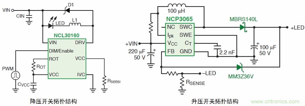用于中等电压通用照明的开关驱动器有多种拓扑,如降压、升压;降压/升压的NCP3065和NCP3066(可以配置为控制器)、NCP3163、MC33163、NCP1294;降压的CAT4201、NCP1034、NCL30100、NCL30105、NCL30160、NCL30161;此外还有升压或SEPIC的CS5171/3。