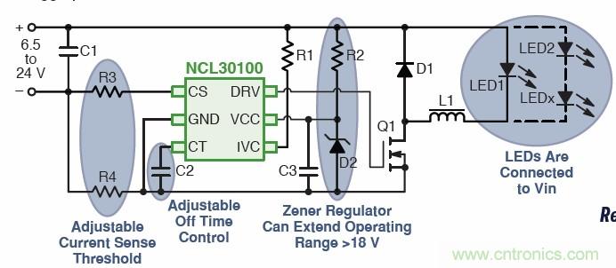 针对空间及高能效要求的低功率应用,安森美半导体提供一款能效高达95%,又具有自然LED开路?;さ墓潭ü乇帐奔浣笛筁ED驱动器控制器NCL30100。该器件采用准固定关闭时间、峰值电流迟滞控制方法,不要求补偿元件;其低边N-FET开关拓扑适合连续导电模式工作,无须输出电容;其工作频率小于500 kHz,±5%典型稳流容限,VCC工作电压范围为6.35至18 V。