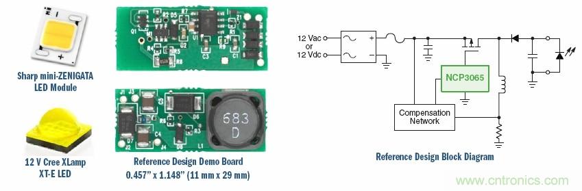 对于3至4个LED模块的12 V AC-DC设计,可以使用安森美半导体针对NCP3065的评估板NCP3065BBGEVB,用来驱动12 Vac/Vdc应用中的夏普ZENIGATA™、Cree XLamp™MC-E及其他LED??椤F涮氐闶切〕叽?、宽输入和输出工作电压,输出电流经过稳流,还具有LED开路?;?、输出短路?;つ芰Α8媒饩龇桨甘视糜贛R16灯泡、景观照明、交通照明。