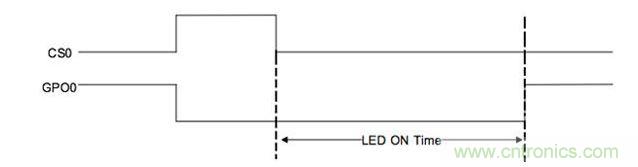 通常对于电容式按键来说,LED直接位于按键之下,从中心位置发光。用户手指放在按键上,LED就会被隐藏起来。在此情况下,如果用户手刚从按键上拿开LED灯就马上关闭,那么用户可能难以确定按键操作到底成功没有。为此,我们可以让LED在触摸结束后保持“开启”一小段时间,从而为用户提供更好的视觉反馈。这种特性就叫LED开启时间,如图2所示。