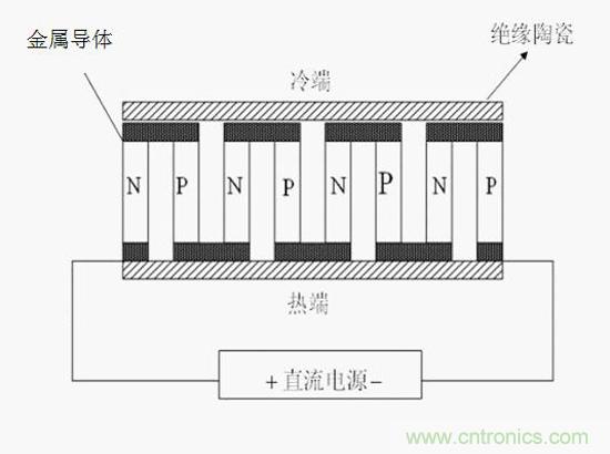 半导体制冷又称电子制冷,或者温差电制冷,是从50年代发展起来的一门介于制冷技术和半导体技术边缘的学科,与压缩式制冷和吸收式制冷并称为世界三大制冷方式。半导体制冷器的基本器件是热电偶对,即把一只N型半导体和一只P型半导体连接成热电偶(如图1),通上直流电后,在接口处就会产生温差和热量的转移。在电路上串联起若干对半导体热电偶对,而传热方面是并联的,这样就构成了一个常见的制冷热电堆。借助于热交换器等各种传热手段,是热电堆的热端不断散热并且保持一定的温度,而把热电堆的冷端放到工作环境中去吸热降温,这就是半导体制冷的原理。