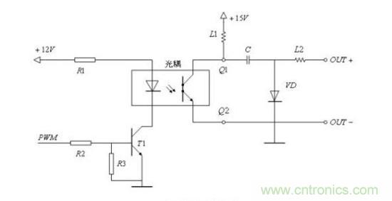限于篇幅有限,下面仅对此PWM控制电路进行简单的介绍:当PWM控制信号为低电平时,晶体管T1处于截止状态,光电耦合器中发光二极管的电流近似为零,输出端Q1和Q2间的电阻很大,相当于开关“断开”;当PWM波控制信号为高电平时,晶体管T1处于导通状态,光电耦合器中发光二极管发光,输出端Q1和Q2间的电阻很小,相当于开关“导通”.由上面介绍可知,当DS18B20采集的实时温度小于制冷启动温度时,光电耦合器的PWM输入端无信号输入时,光电耦合器处于不工作状态,图5中的OUT+端和OUT-端无输出电压,即半导体制冷片处于闲置状态;当DS18B20采集的实时温度大于制冷启动温度时,光电耦合器的PWM输入端有信号输入,图3中的OUT+端和OUT-端即有输出电压。通过PWM调制波控制Q1和Q2两端的通断,即可实现对半导体制冷片TEC工作电压的控制,进而控制了半导体制冷片TEC的散热功率。图3中的OUT+端和OUT-端分别接在半导体制冷片TEC的输入端线上。根据CUK电路的输出电压和供电电源电压的关系,可得出PWM波占空比和半导体制冷片TEC输入电压的关系: