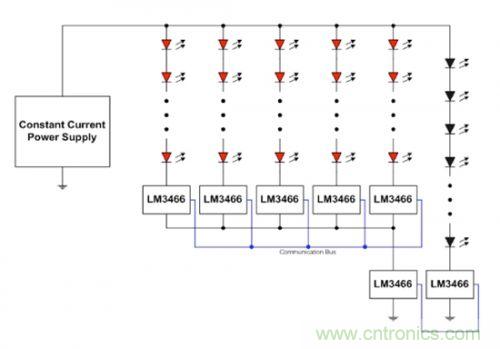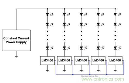 在本应用中,LM3466 集成电路可互相通信,确保恒定电流电源所强加的输入电流能够在各串之间进行平均分配。线性稳压器会吸收 LED 堆栈正向电压的任何差异。