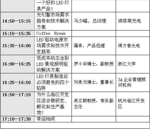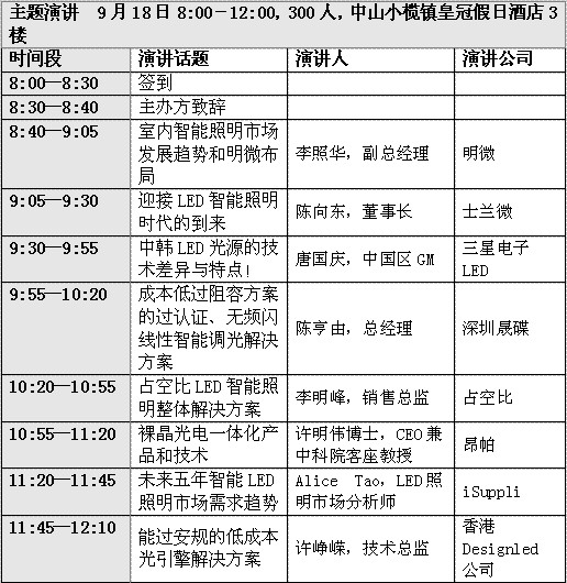 到目前为止,已邀请到的演讲嘉宾包括:明微副总经理李照华、占空比销售总监李明峰、昂帕CEO许明伟博士、士兰微董事长陈向东、DesignLed技术总监许峥嵘、晟碟总经理陈亨由、埃菲莱总经理马少峰、三星LED总经理唐国庆、飞泰科技董事长董沛、iSuppli LED照明市场分析师Alice Tao、3A企业管理顾问机构董事长刘承元博士、德力普产品经理蒲承、浙江大学罗小华教授、杭州临江高新开发区常务副主任吴立群教授。