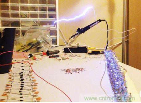 火花间隙可用弯曲的电阻和电容连接各级组成,不过你需要时刻关注这过程,通常用螺丝刀操作触发第一个火花间隙更有效,这样可使后续各级火花更完美。