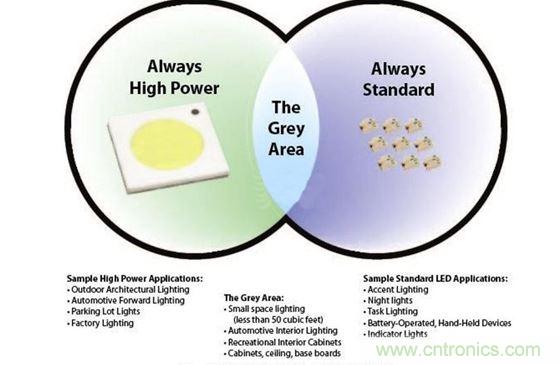 体积较小、通过电池供电或便携式的设备(例如消费类电子产品、重点照明和标准指示灯等),已经在很长一段时间内使用了标准LED,而且有可能继续使用。同样,一些领域将会继续使用大功率LED技术,包括:一般户外照明、大面积的室内照明(轨道灯、灯泡替换物)以及汽车前照灯等。