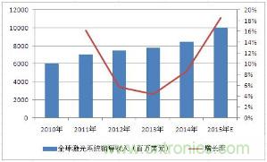 2010---2015年全球激光设备销售规模(单位:百万美元)