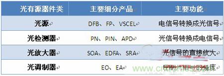 光通信器件包括光有源器件和光无源器件,有源无源按照是否需加外界能源驱动来区分。光有源器件主要负责光信号的产生、放大和接收,完成信号的光-电-光转换和放大等功能。光有源器件包括光纤放大器、光纤激光器、光收发器和光调制器,这些器件都是光发射机、光接收机和光中继器的关键器件,和光纤一起决定着基本光纤传输系统的水平。