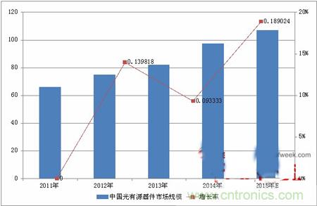 据OFweek行业研究中心出版的《2015-2018年中国光有源器件市场分析及前景预测报告》显示,2011年-2014年中国光有源器件市场规模增长较快,年复合增长率达到14%。未来几年会有所放缓,年复合增长率会降至10%左右。2014年中国光有源器件市场规模为97.5亿元人民币,估计2015年将达到107亿元。