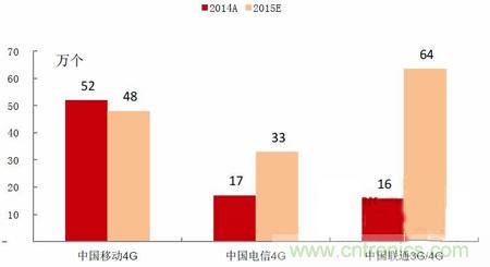 图表3 2014、2015年三大运营商新增4G基站数量(单位:万个)