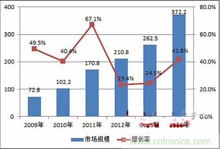 图表5 2009-2014年中国IDC行业市场规模及增长(单位:亿元,%)