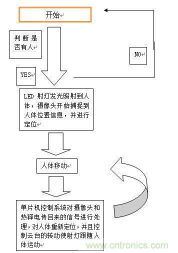系统初始化之后,对状态进行判断,若没检测到人,则一直处于检测状态;若检测到有人,则单片机控制IO口打开开关使得LED射灯发光照射到人体,摄像头开始捕捉人体位置信息,并进行定位;当人体移动时,单片机控制系统对热释电和摄像头传回来的信号进行处理,对人体重新进行定位,并且控制云台转动使射灯跟随人体运动;当人体再移动,便继续“人体移动----数据处理---转动云台”这个循环过程。