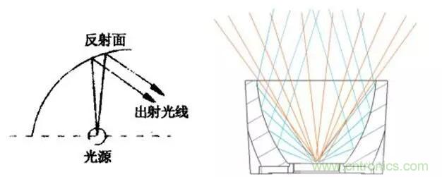 例如我们希望得到一个超窄光束角,如果使用卤素灯珠(废话荧光灯当然不行了…),需要计算一个抛物线反射面,抓取灯珠往反射器方向这一半的光,变成平行光发出,同时还要遮盖掉灯珠往外方向的光,以避免影响配光曲线(可参考QR111的结构,金卤灯原理相同)。