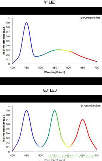 不管是投影仪还是电视机都采用的是RGB-LED光源,也就是红黄蓝三色LED光源,而这3种颜色的LED,以“蓝光LED”最为重要,减弱蓝光则会使色彩失真,整体画面色调偏红黄。一起看看LED显示器两种主要发光??閃-LED(常用)和GB-LED的光谱组成。如下图: