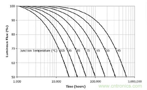 那么泡壳内的环境温度能够允许105度吗?只要看一下下面的一个图片就知道了。那是美国Cree公司有关LED芯片结温和光衰之间的关系。