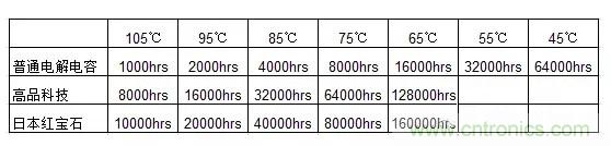 3、各种寿命的电解电容在45℃的环境温度下的实际寿命
