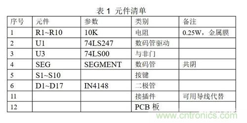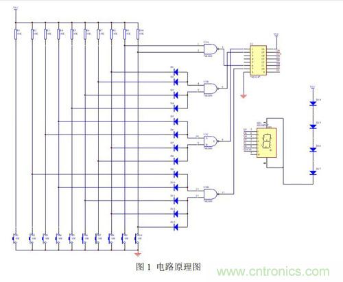 如图1所示,电路由与非门74LS00、数码管驱动芯片74LS247组成。10个按键组成输入电路,经过与非门电路编码后,输入数码管驱动芯片,驱动数码管显示相应的按键号。
