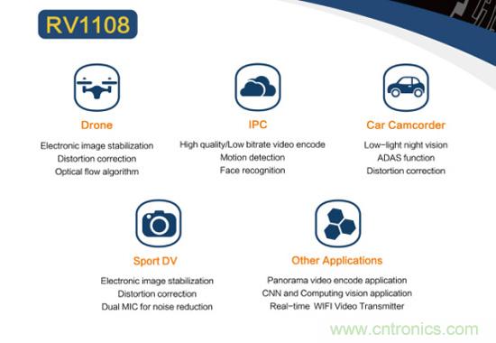 展会上,瑞芯微展示了诸多基于RV1108的IoT物联网应用终端,包含DRV智能后视镜、运动DV、VR全景摄像机、IP Camera、无人机等产品。