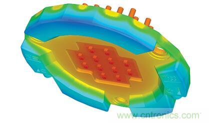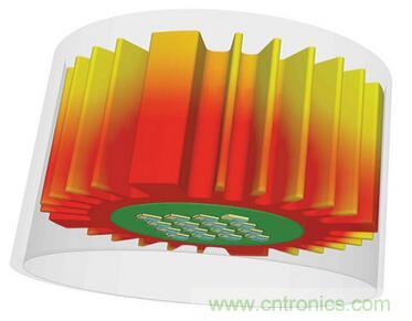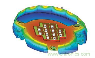 LED灯具设计师所面临的挑战是如何将所有这些东西都放在可用的空间中,同时确保成品内部和外部关键点的温度保持在可接受的范围内。这时候,热模拟就能起到作用,特别是在整个设计过程中。图2示出了在热模拟下有良好散热的芯片??榉独?。