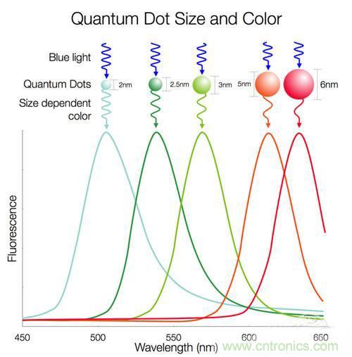 不同大小尺寸的量子点会发出不同的颜色,量子点当受到光或电的刺激时,就发出有色光线,光线的颜色由量子点的组成材料和大小形状决定,一般颗粒越小,会吸收长波,颗粒越大,会吸收短波。